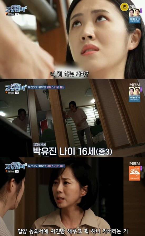 하지만 박유진 어머니는 아이를 다른 곳으로 입양을 보내는 선택을 했다. 어머니는 "네 나이 16살에 인생 끝내고 싶냐. 우리 형편에 어떻게 애를 낳아 키우냐. 좋은 부모 만나서 좋은 집안에서 사랑받으면서 자라는 게 애한테도 나아"라고 말했다.