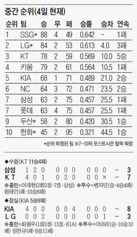 SSG 랜더스가 창단 2년 만에 정규 시즌 우승 트로피를 품에 안았다. SSG는 2위로 추격전을 벌이던 LG가 4일 잠실 홈 경기에서 KIA에 3대8로 지면서 남은 경기에 관계없이 1위가 확정됐다. SSG가 남은 3경기를 모두 져도 승률이 0.629가 되고, LG가 5전 전승을 거둬도 승률이 0.627에 그친다.