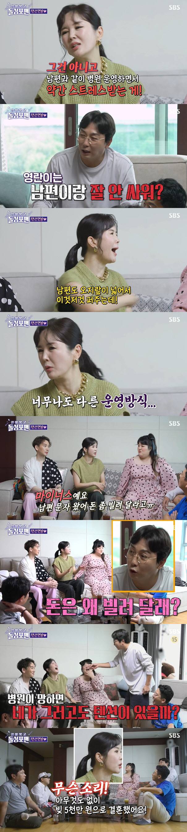 하지만 돌싱포맨들은 "최근에 힘들었던 일은 없냐?"라며 거듭 물었고, 이에 장영란은 "사실 요새 남편과 병원을 같이 운영하면서 스트레스 받는 부분이 있다. 남편도 오지랖이 넓어서 이것 저것 퍼주는 스타일이다. 상담하러 온 환자분들에게 한약 먹지 말고 마인드 컨트롤을 하라고 하면서 약을 안 판다"고 고민을 털어놨다.