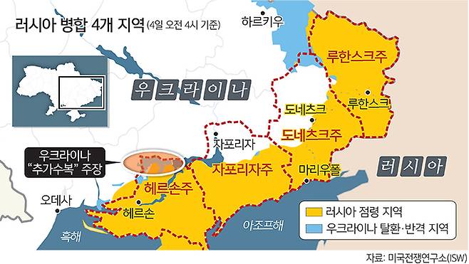 러시아의 핵 위협이 노골화됐다는 징후는 강제 병합한 우크라이나 동남부 4개 지역에서 수세에 몰리는 상황에서 나온 것이다. 러시아 상원이 이날 점령지 병합 조약을 만장일치로 비준하면서 최종 절차까지는 푸틴 대통령의 서명만 남았다. 거침없는 러시아의 행보가 무색하게도, 우크라이나군은 해당 지역에서 일부 도시를 수복하고 있다.
