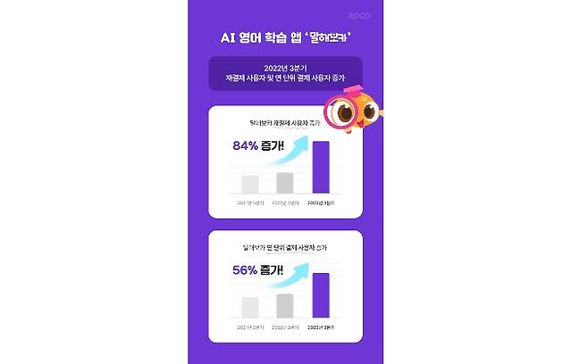 인공지능(AI) 기반 영어 학습 애플리케이션 '말해보카'를 운영하는 이팝소프트(대표 박종흠, 최영민)가 2022년 3분기에 말해보카의 유료 재결제 사용자 수가 크게 증가했다고 밝혔다.