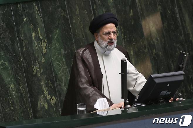(테헤란 로이터=뉴스1) 김성식 기자 = 4일(현지시간) 이란 테헤란에서 에브라힘 라이시 대통령이 의회에 방문해 연설하고 있다.