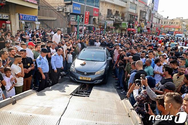 (나블루스 AFP=뉴스1) 김성식 기자 = 4일(현지시간) 팔레스타인 요르단강 서안지구에 위치한 나블루스에서 팔레스타인 보안군이 나블루스에 들어온 이스라엘 차량 한 대를 견인차에 올리고 있다. 팔레스타인 군은 성명을 통해 이스라엘 민간인 다수가 나블루스에 진입해 이들을 호송한 뒤 추방했다고 밝혔다.