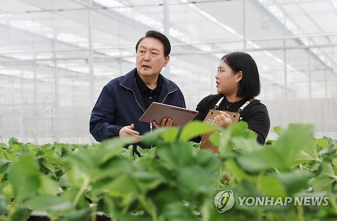 (상주=연합뉴스) 서명곤 기자 = 윤석열 대통령이 5일 오전 경북 상주시 스마트팜 혁신밸리를 방문, 딸기 온실에서 청년농업인 신나라 씨의 안내에 따라 태블릿PC를 조작해 분무기와 냉풍기를 작동해보고 있다. 2022.10.5