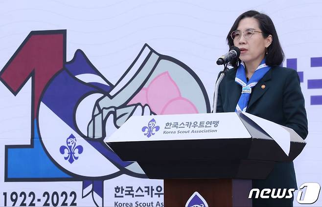 (서울=뉴스1) = 김현숙 여성가족부 장관이 5일 오전 고양시 한국스카우트연맹 중앙훈련원에서 열린 '한국스카우트운동 100주년 창립기념식'에 참석해 축사를 하고 있다. (여성가족부 제공) 2022.10.5/뉴스1