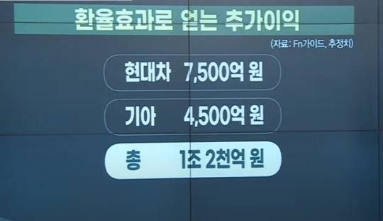원·달러 환율 1% 오를 때마다 현대차의 영업이익은 500억 원, 기아는 300억 원 늘어나는 것으로 추산됩니다.3분기 평균 환율이 지난해 같은 기간과 비교해 15% 가량 올랐는데, 계산해보면 현대차와 기아가 환율효과만으로 총 1조 2천억 원의 추가 이익을 볼 것으로 예상됩니다.