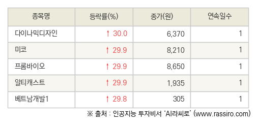 05일 다이나믹디자인(145210), 미코(059090), 프롬바이오(377220), 알티캐스트(085810), 베트남개발1(096300)등이 상한가를 기록했다. 특히 다이나믹디자인은 전 거래일 대비 30.0% 오른 6,370원에 거래를 마감하며 높은 관심을 받았다.
