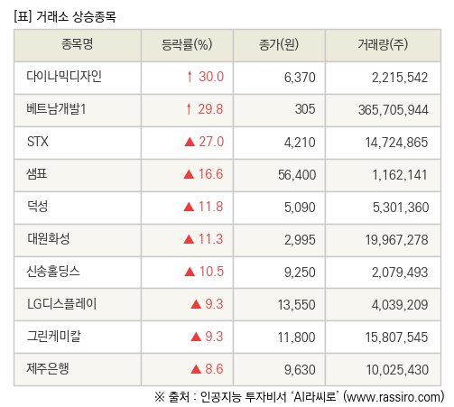 [fnRASSI]장마감, 거래소 상승 종목(다이나믹디자인 30.0% ↑)