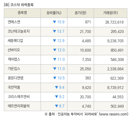 [fnRASSI]장마감, 코스닥 하락 종목(엔에스엔 -15.9% ↓)