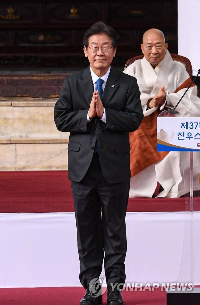 (서울=연합뉴스) 더불어민주당 이재명 대표가 5일 오후 서울 종로구 조계사 대웅전 앞에서 열린 대한불교조계종 제37대 총무원장 진우스님 취임법회에서 축사하기 전 합장하고 있다. 2022.10.5 [국회사진기자단]