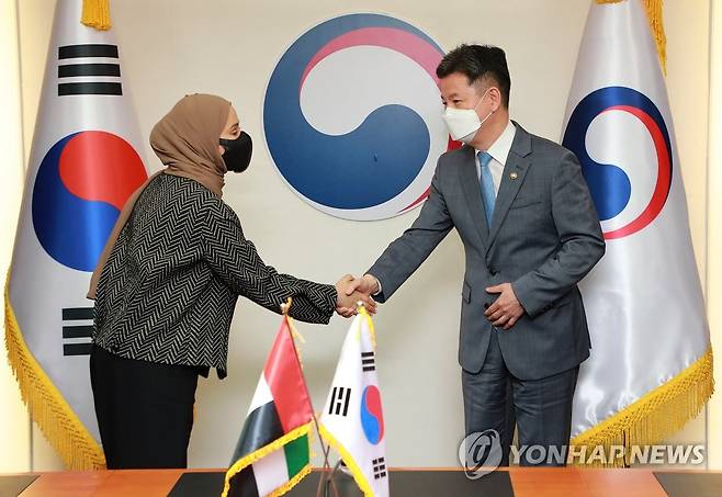(서울=연합뉴스) 한창섭 행정안전부 차관이 5일 정부서울청사에서 UAE 오후드 칼판 알 루미 특임장관를 만나 악수하고 있다. 2022.10.5 [행정안전부 제공. 재판매 및 DB 금지]