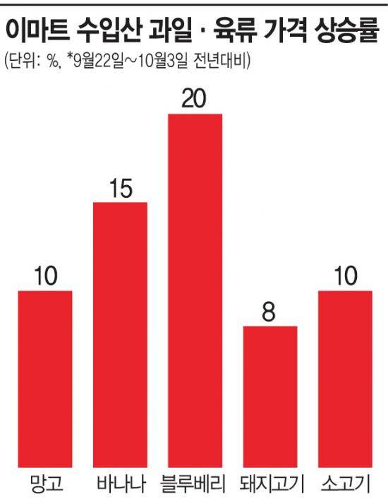 5일 이마트에 따르면 원 달러 환율이 1400원을 넘어선 지난달 22일부터 이달 3일까지 망고 판매 가격은 전년 대비 약 10%, 바나나는 15%, 블루베리는 20% 상승했다. 홈플러스에서는 바나나(10%), 블루베리(13%) 등 가격이 올랐다. 이는 코로나19 사태 이후 산지 생산·인건비 인상으로 원가가 올랐고, 물류비 상승 및 달러 초강세 현상까지 이어지면서 수입 단가를 끌어올리고 있어서다.