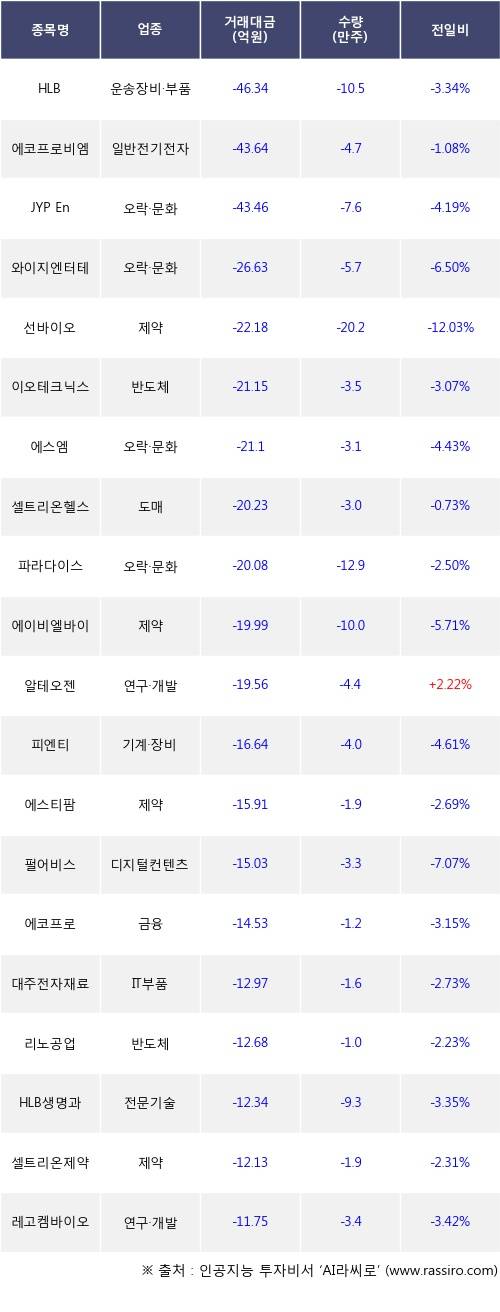기관 투자자의 순매도 상위 20개 종목은 HLB, 에코프로비엠, JYP Ent., 와이지엔터테인먼트, 선바이오, 이오테크닉스, 에스엠, 셀트리온헬스케어, 파라다이스, 에이비엘바이오등이다.