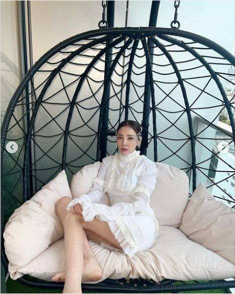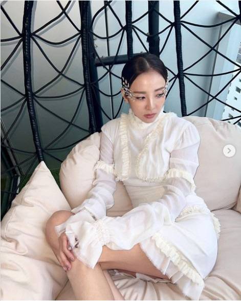 사진 속에는 쇼파 위에 앉아 포즈를 취한 산다라박의 모습.