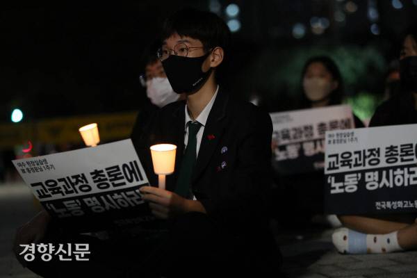 전국특성화고노동조합 소속 학생 및 시민들이 5일 서울 용산구 대통령 집무실 앞에서 여수 현장실습생 고 홍정운씨의 산재사망 1주기 추모 집회를 하고 있다.
