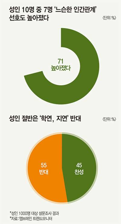 엠브레인 트렌드모니터가 성인 1000명을 대상으로 설문조사한 결과 응답자의 55%가 우리 사회에서 학연·지연 문화는 없어져야 한다고 답했다. 기존에 잘 알고 지냈던 사람들과의 관계가 부담스럽게 느껴지거나(20대 38.4%, 30대 38%, 40대 35.2%, 50대 31.6%) 요즘에는 한두 번 만난 사람들과의 관계가 더 편한 것 같다는 응답(20대 32%, 30대 32.4%, 40대 30%, 50대 27.6%)도 많았다. 학연과 지연의 중요성이 예전 같지 않다는 응답도 46.9%에 달했다.
