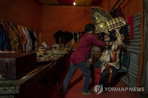 An artist dressed as the demon king Ravana, right, tries to put on an 8-headed crown before a performance of a traditional Ramleela drama to celebrate the festival of Dussehra in New Delhi, India, Tuesday, Oct. 4, 2022. Ramleela is a dramatic folk re-enactment of the life of Hindu lord Rama. After the enactment of the legendary war between Good and Evil, the Ramleela celebrations climax in the Dussehra night festivities where the giant effigies of demon King Ravana, his brother Kumbakaran and son Meghnad are burnt, typically with fireworks. (AP Photo/Altaf Qadri)