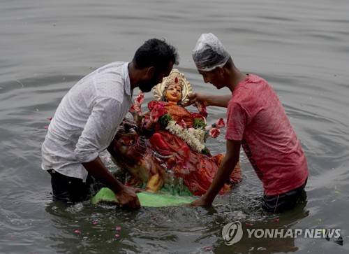 Workers immerse an idol of Hindu Goddess Durga in Hussain Sagar Lake on the last day of Durga Puja festival in Hyderabad, India, Wednesday, Oct. 5, 2022. The festival commemorates the slaying of a demon king by lion-riding, ten armed goddess Durga, marking the triumph of good over evil. (AP Photo/Mahesh Kumar A.)