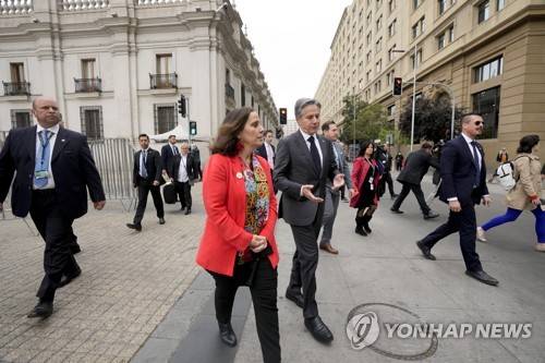 Chilean Foreign Minister Antonia Urrejola, front, walks with U.S. Secretary of State Antony Blinken outside La Moneda palace in Santiago, Chile, Wednesday, Oct. 5, 2022. (AP Photo/Esteban Felix, Pool) POOL