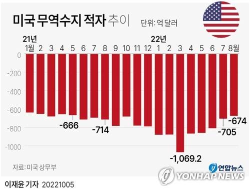 (서울=연합뉴스) 이재윤 기자 = 미국 상무부는 8월 상품·서비스 등 무역수지 적자가 674억달러(약 95조7천억원)로 전월보다 4.3% 감소했다고 5일(현지시간) 밝혔다.