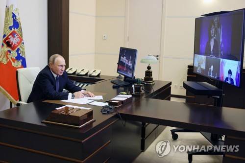 Russian President Vladimir Putin speaks during a meeting with the winners and finalists of the School Teacher of the Year national contest via videoconference at the Novo-Ogaryovo residence outside Moscow, Russia, Wednesday, Oct. 5, 2022. (Gavriil Grigorov, Sputnik, Kremlin Pool Photo via AP) POOL PHOTO