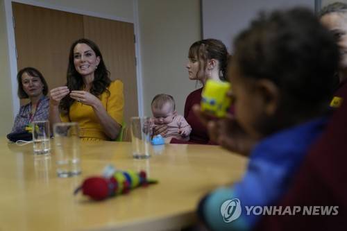 Britain's Kate, the Princess of Wales centre, gestures, during a visit to the Royal Surrey County Hospital's maternity unit, in Guilford, England, Wednesday, Oct. 5, 2022.(AP Photo/Alastair Grant, Pool) POOL PHOTO