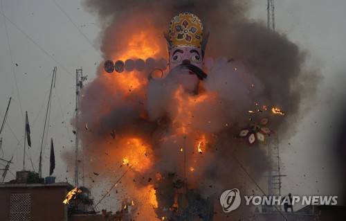 An effigy of mythical demon king Ravana goes up in flames marking the end of Dussehra festival in Jammu, India, Wednesday Oct.5, 2022. Dussehra commemorates the triumph of Lord Rama over the demon king Ravana, marking the victory of good over evil. (AP Photo/Channi Anand)
