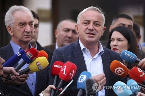 Branislav Borenovic, leader of Party of Democratic Progress (PDP), addresses the media after submitting a request for a recount and cancellation of election for the President of the Republic of Srpska, in Sarajevo, Bosnia, Wednesday, Oct. 5, 2022. (AP Photo/Armin Durgut)