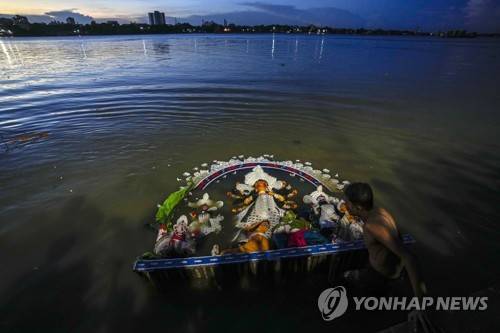 A man pushes an idol of Hindu goddess Durga towards deeper water after it was immersed in the Hooghly River, in Kolkata, India, Wednesday, Oct. 5, 2022. The immersion of idols marks the end of the festival that commemorates the slaying of a demon king by lion-riding, 10-armed goddess Durga, marking the triumph of good over evil. (AP Photo/Bikas Das)