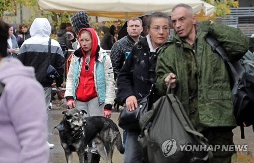 epa10224817 Russian conscripted men say goodbye to relatives at a recruiting office during Russia's partial military mobilization in Moscow, Russia, 05 October 2022. Russian President Putin announced in a televised address to the nation on 21 September, that he signed a decree on partial mobilization in the Russian Federation due to the conflict in Ukraine. Russian Defense Minister Shoigu said that 300,000 people would be called up for service as part of the move. EPA/MAXIM SHIPENKOV