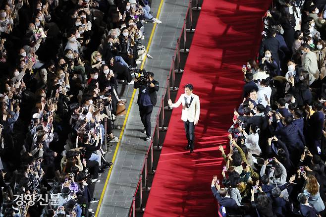 홍콩 배우 량차오웨이(양조위)가 5일 부산 해운대구 영화의전당 야외무대에서 열린 제27회 부산국제영화제(BIFF) 개막식에 입장하고 있다. 부산국제영화제가 인원 제한 없이 정상적으로 개최된 건 코로나19 유행 이후 3년 만이다.