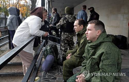 epa10224821 Russian conscripted men say goodbye to relatives at a recruiting office during Russia's partial military mobilization in Moscow, Russia, 05 October 2022. Russian President Putin announced in a televised address to the nation on 21 September, that he signed a decree on partial mobilization in the Russian Federation due to the conflict in Ukraine. Russian Defense Minister Shoigu said that 300,000 people would be called up for service as part of the move. EPA/MAXIM SHIPENKOV
