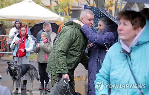 epa10224816 Russian conscripted men say goodbye to relatives at a recruiting office during Russia's partial military mobilization in Moscow, Russia, 05 October 2022. Russian President Putin announced in a televised address to the nation on 21 September, that he signed a decree on partial mobilization in the Russian Federation due to the conflict in Ukraine. Russian Defense Minister Shoigu said that 300,000 people would be called up for service as part of the move. EPA/MAXIM SHIPENKOV