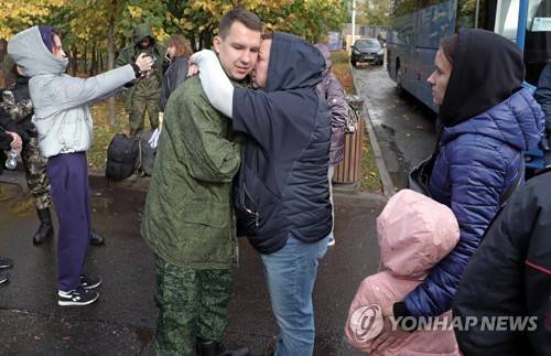 epa10224836 Russian conscripted men say goodbye to relatives at a recruiting office during Russia's partial military mobilization in Moscow, Russia, 05 October 2022. Russian President Putin announced in a televised address to the nation on 21 September, that he signed a decree on partial mobilization in the Russian Federation due to the conflict in Ukraine. Russian Defense Minister Shoigu said that 300,000 people would be called up for service as part of the move. EPA/MAXIM SHIPENKOV