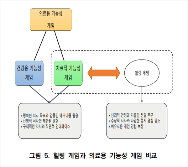 건국대학교 문화콘텐츠학과 보고서 '힐링 게임의 개념과 주요 특징에 관한 연구'는 힐링 게임과 쉽게 혼용되었던 의료용 기능성 게임(또는 치료적 기능성 게임)과의 비교 분석을 통해 힐링 게임의 개념을 보다 명확히 정의내렸다. 기능성 게임과 차별화되는 힐링 게임의 주요 특징은 크게 세 가지다.