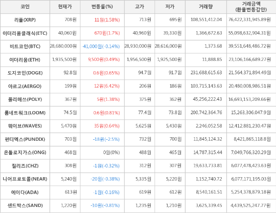 가상화폐 시세 (제공: 암호화폐 거래소 업비트)현재 암호화폐 거래소 "업비트"에 따르면 가상화폐 대장 격인 비트코인의 시세는 전일 대비 -41,000원(-0.14%) 하락한 28,680,000원에 거래되고 있다.