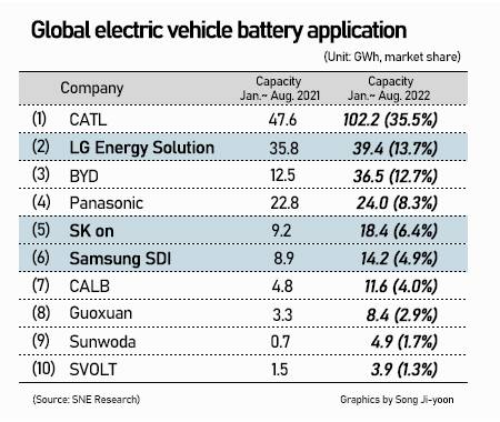 Korea's three battery giants account for 25%, further behind China's CATL at 35.5% Jan-Aug