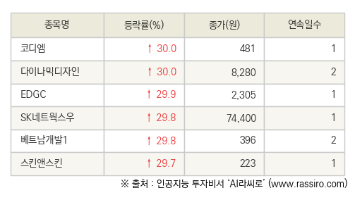 [fnRASSI]오늘의 상한가, 코디엠 30.0% ↑