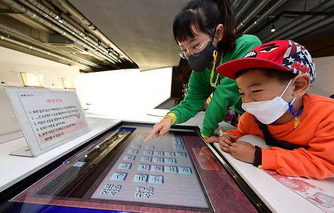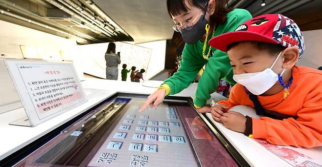 제576돌 한글날을 사흘 앞둔 6일 서울 종로구 세종이야기 전시관에서 어린이들이 자음과 모음을 조합하며 훈민정음의 창제 원리를 디지털로 체험하고 있다.