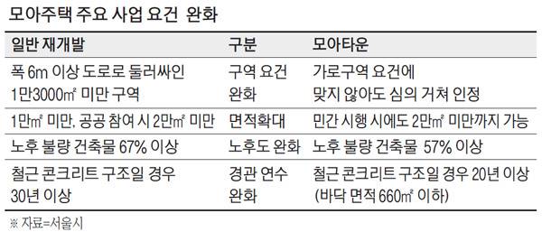조례 개정 등을 통해 완화된 모아타운 내 가로주택정비사업 기준은 제2종 일반주거지역(7층 이하)의 층수 완화(10층 이하→평균 13층 이하)와 제2종 일반주거지역 층수 완화(15층 이하→층수 폐지 예정), 노후도 완화(67% 이상→57% 이상), 바닥면적 660㎡ 이하 공동주택 경관 연수 완화(30년 이상→20년 이상) 등이다.