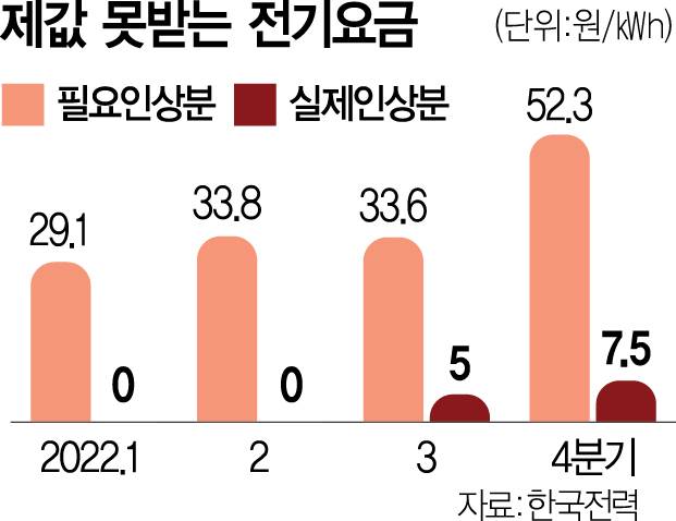 내년 전기요금이 올 초 대비 50% 이상, 이달과 비교해도 30% 이상 급등할 것으로 전망된다. 현행 전기요금을 결정하는 핵심 지표인 ‘기준연료비’가 내년에 2배가량 껑충 뛸 것이 확실시되기 때문이다. 기획재정부는 요금 인상을 최대한 억제할 방침이지만 한국전력의 회사채 발행 급증에 따른 시장 금리 상승, 원가 대비 낮은 전기요금으로 인한 전력 과소비 등 부작용 때문에 ‘시장 쇼크’ 수준의 전기료 인상이 불가피할 것이라는 관측이 나온다.
