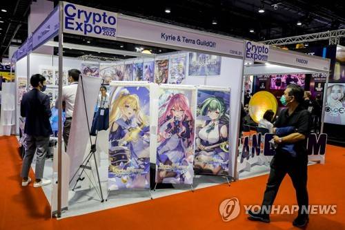 epa10226453 A visitor walks past a booth promoting a crypto game and NFT at the Thailand Crypto Expo 2022 in Bangkok, Thailand, 06 October 2022. According to the organizers, the four-day Expo aims to introduce investors to the world of blockchain technology and digital currency, showcasing an array of precuts such as upcoming crypto projects, cryptocurrency exchanges and trading platforms, crypto mining software, cold wallets, non-fungible tokens (NFTs), and GameFi. EPA/DIEGO AZUBEL