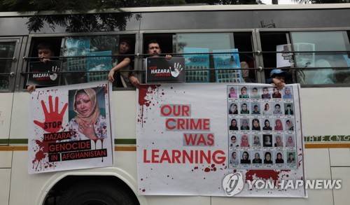 epaselect epa10226575 Afghanistan Refugees living in Delhi hold placards as they sit inside the bus during a protest against Hazara 'genocide' after Kabul bombing, in New Delhi, India, 06 October 2022. The United Nations Assistance Mission in Afghanistan on 03 October, raised the casualties of the Friday suicide bombing at an educational center in Kabul to 53 dead and 110 wounded, days after the attack targeted members of the marginalized Shia Hazara community. So far no group has claimed responsibility for the attack, which was condemned by both the Taliban and the international community, while women held protests against the bombing in different parts of Afghanistan. EPA/RAJAT GUPTA