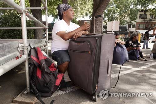 Eric Santos uses a suitcase that he keeps all of his possessions in as a table while having a cup of coffee at ShowUp Sac, a nonprofit that provides food, clothing and showers to people experiencing homelessness in Sacramento, Calif., Tuesday, Aug. 9, 2022. Santos, who was recently evicted from his apartment and now sleeps on a park bench, frequents Show Up Sac, for meals and other assistance. Sacramento County had more than 9,200 people experiencing homelessness during this year's annual count, conducted in February. (AP Photo/Rich Pedroncelli)