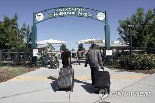 Two men walk to Friendship Park at Loaves & Fishes, a nonprofit facility for the homeless in Sacramento, Calif., Monday, Aug. 15, 2022. Sacramento County had more than 9,200 people experiencing homelessness during this year's annual count, conducted in February. (AP Photo/Rich Pedroncelli)