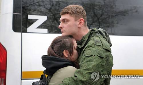 epa10226754 A Russian conscripted man says goodbye to relatives at a recruiting office during Russia's partial military mobilization in Moscow, Russia, 06 October 2022. Russian President Putin announced in a televised address to the nation on 21 September, that he signed a decree on partial mobilization in the Russian Federation due to the conflict in Ukraine. Russian Defense Minister Shoigu said that 300,000 people would be called up for service as part of the move. EPA/MAXIM SHIPENKOV