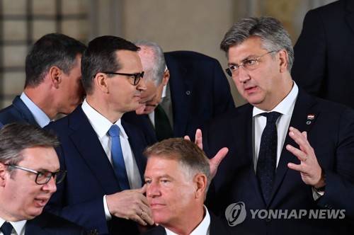 epa10226777 Polish Prime Minister Mateusz Morawiecki (L) and Croatian Prime Minister Andrej Plenkovic (R) during the Meeting of the European Political Community in Prague, Czech Republic, 06 October 2022. The first meeting of the European Political Community brings together leaders from across the continent including non EU members countries with the aims to foster political dialogue and cooperation and to strengthen the continent's security, stability and prosperity, a statement by the European Council reads. EPA/RADEK PIETRUSZKA POLAND OUT