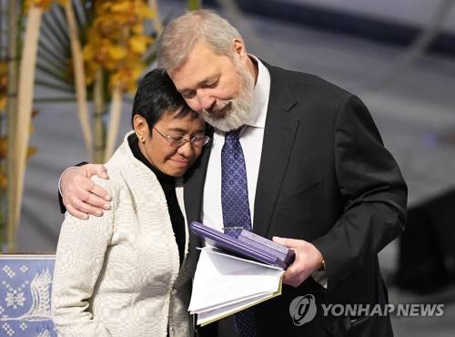 FILE - Nobel Peace Prize winners Dmitry Muratov from Russia, right, and Maria Ressa of the Philippines embrace during the Nobel Peace Prize ceremony at Oslo City Hall, Norway, Friday, Dec. 10, 2021. For the two journalists who won the Nobel Peace Prize in 2021, the past year has not been easy. Dmitry Muratov of Russia and Maria Ressa of the Philippines have been fighting for the survival of their news organizations, defying government efforts to silence them. (AP Photo/Alexander Zemlianichenko, File) FILE PHOTO