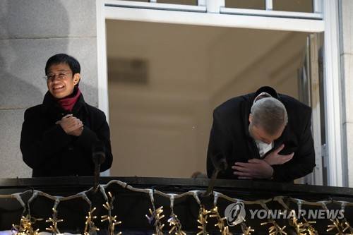 FILE _ Nobel Peace Prize winners Dmitry Muratov from Russia, right, and Maria Ressa of the Philippines acknowledge the crowd gathered below as they stand on the balcony of the Grand Hotel in Oslo, Norway, Friday, Dec. 10, 2021. For the two journalists who won the Nobel Peace Prize in 2021, the past year has not been easy. Dmitry Muratov of Russia and Maria Ressa of the Philippines have been fighting for the survival of their news organizations, defying government efforts to silence them. (AP Photo/Alexander Zemlianichenko, FIle) FILE PHOTO