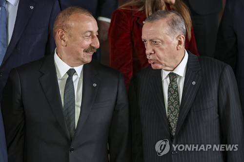 epa10226820 President of Azerbaijan Ilham Aliyev (L) and Turkish President Recep Tayyip Erdogan (R) attend a family photo during the Meeting of the European Political Community in Prague, Czech Republic, 06 October 2022. The first meeting of the European Political Community brings together leaders from across the continent including non EU members countries with the aims to foster political dialogue and cooperation and to strengthen the continent's security, stability and prosperity, a statement by the European Council reads. EPA/MARTIN DIVISEK